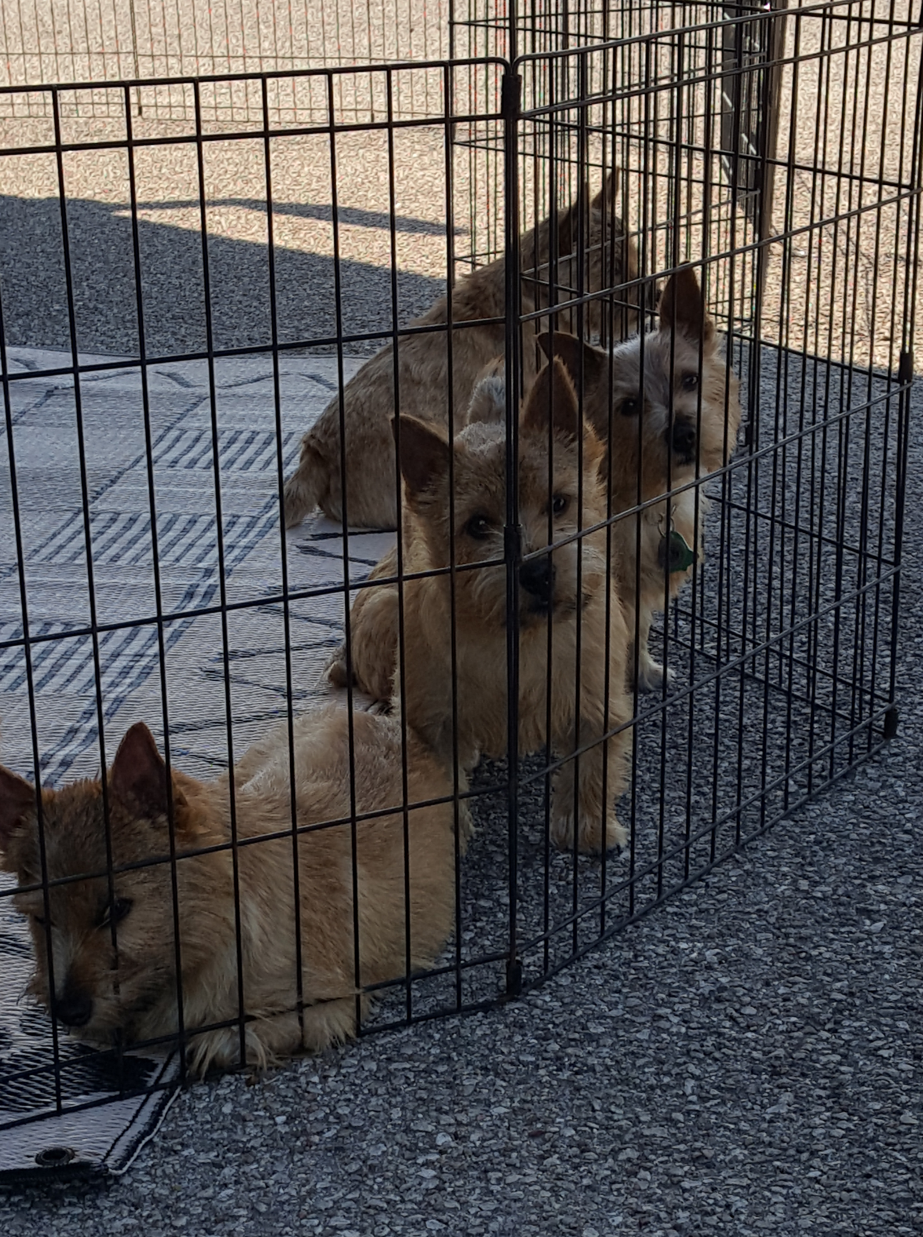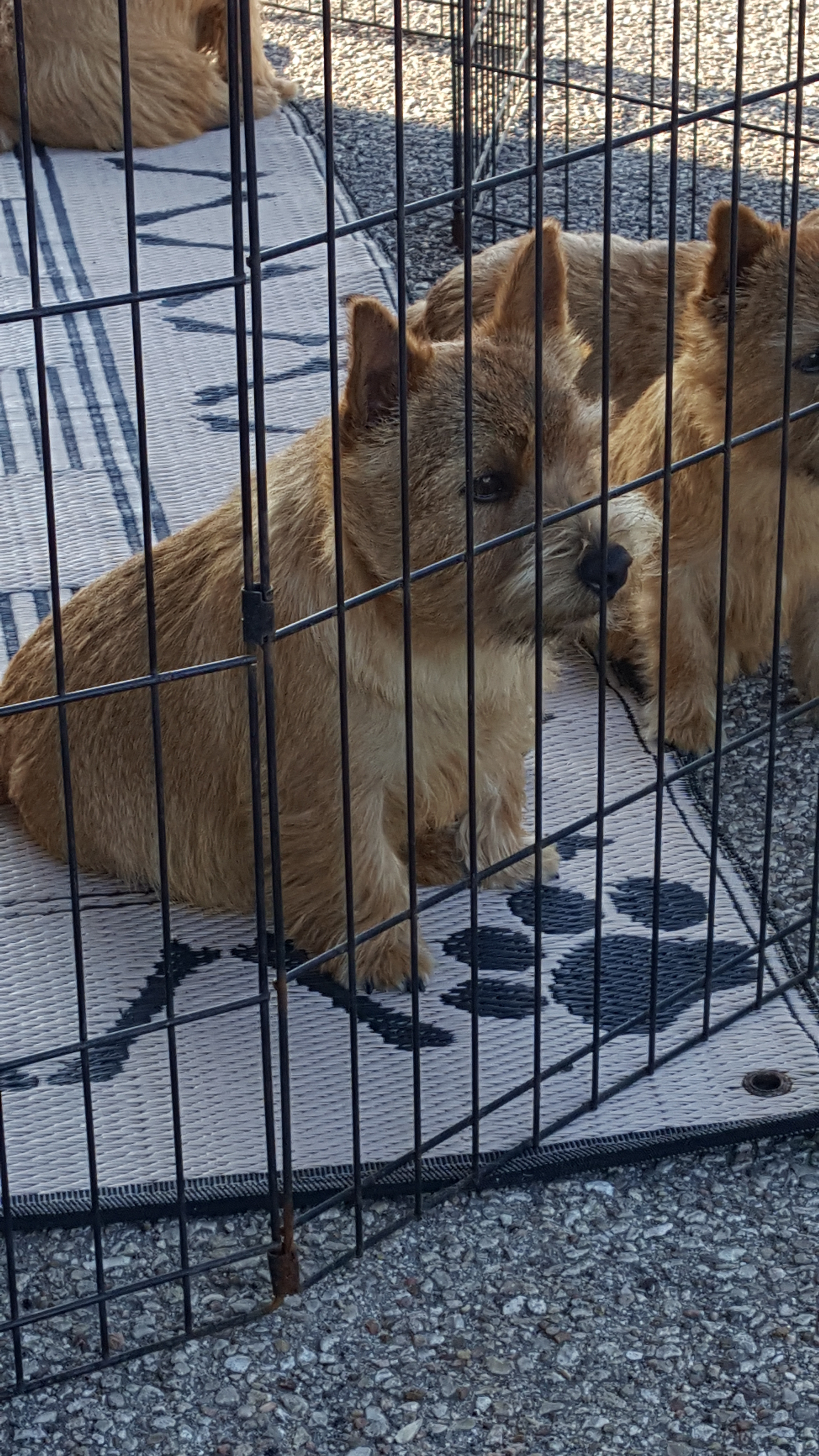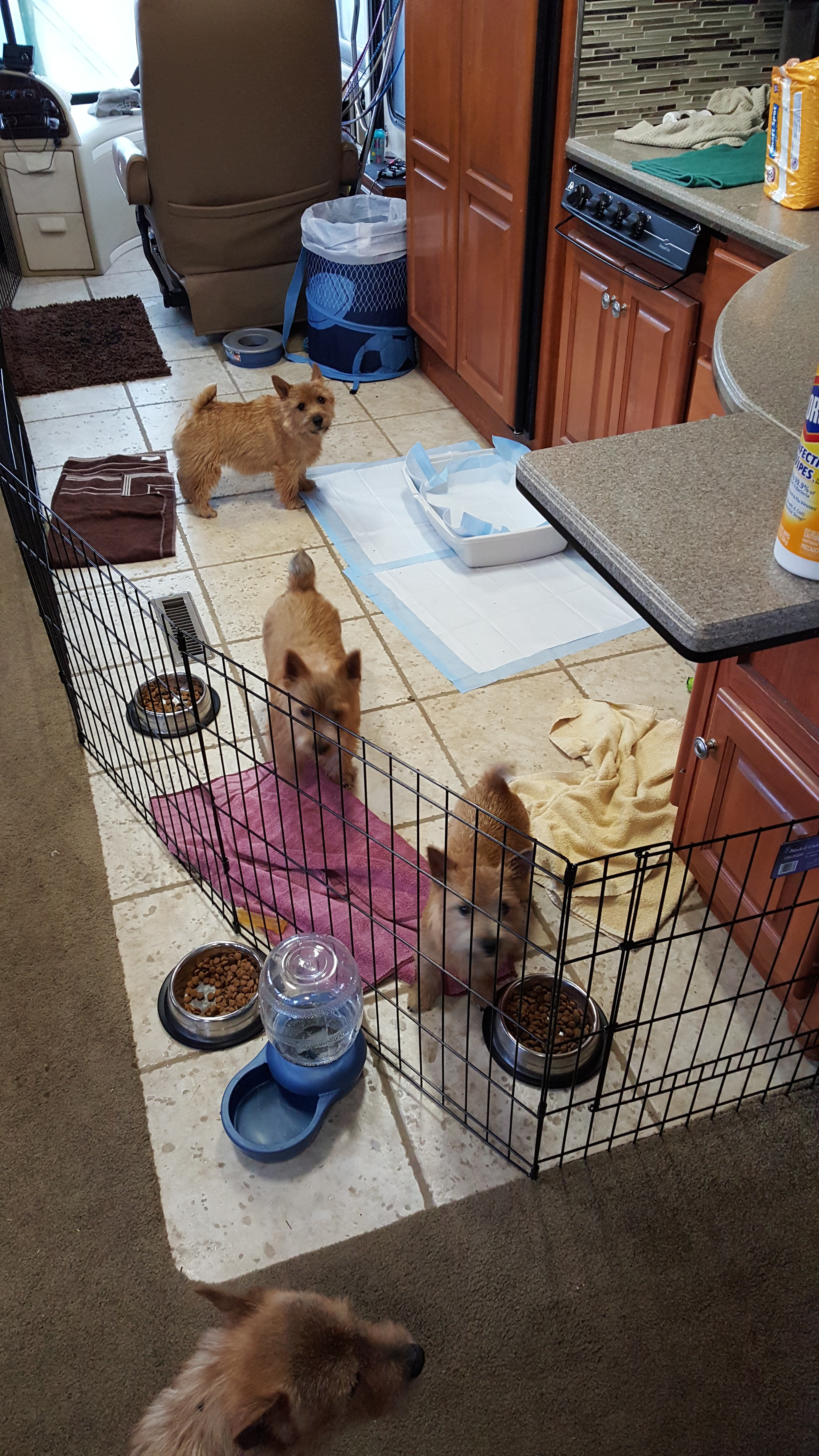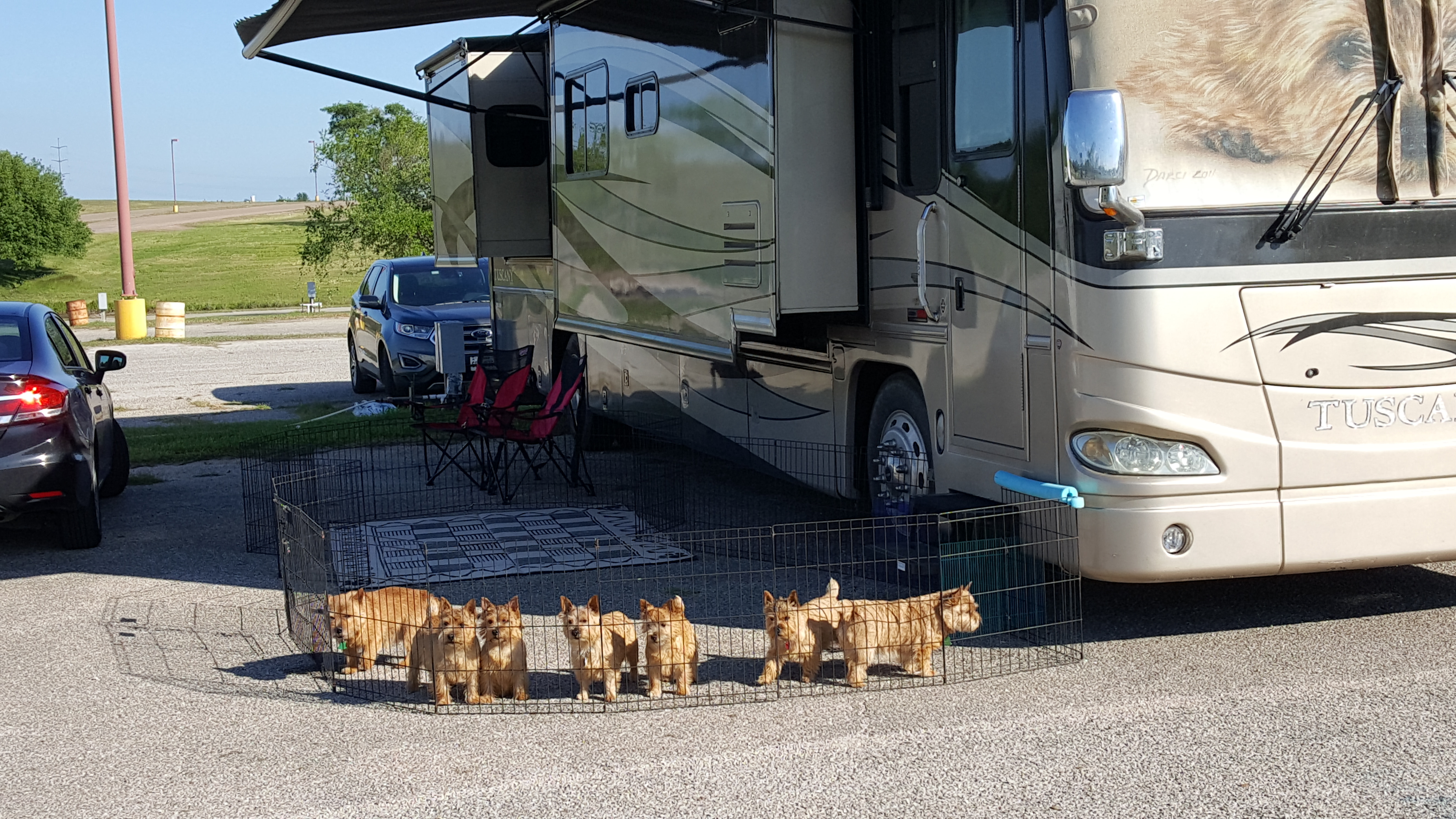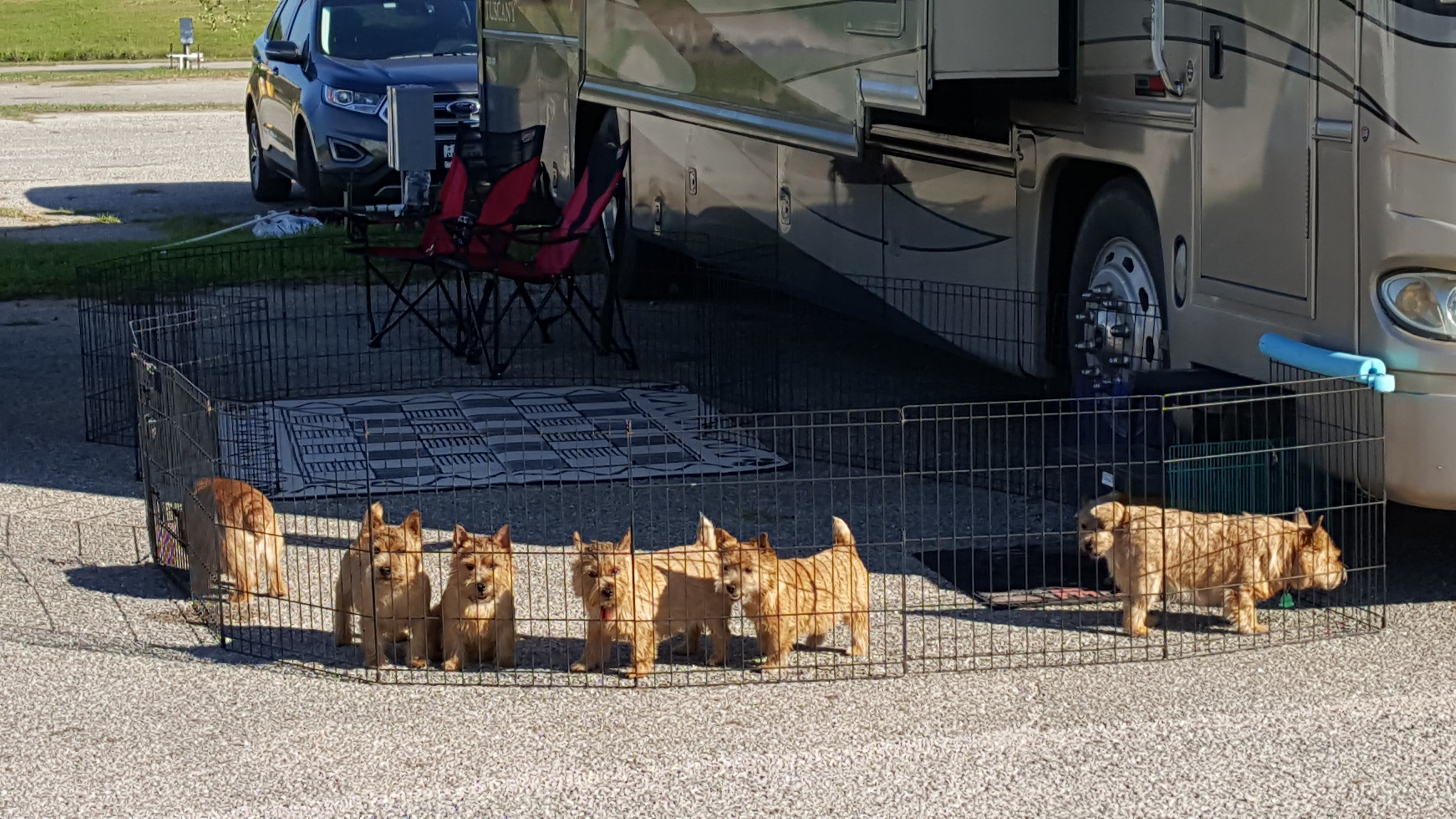 We took all our Norwich Terriers to the Austin Dog Show this last weekend and what fun. A busy weekend for Maria as she spent time with Judi and PW, our Handlers Extraordinaire. All the Norwich Terrier Kids loaded up in the motorhome to go camping. We arrived Friday afternoon to a sunny, cool day. Set out the mat and play pen for the kids and a couple of chairs for us and enjoyed the afternoon.
